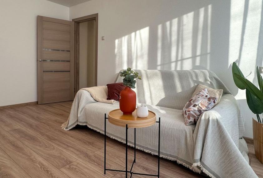 Качественный ремонт: Делали для себя с полной заменой электрики. По всей квартире уложен премиальный ламинат единым полотном без порожков — это выглядит эстетично и облегчает уборку.