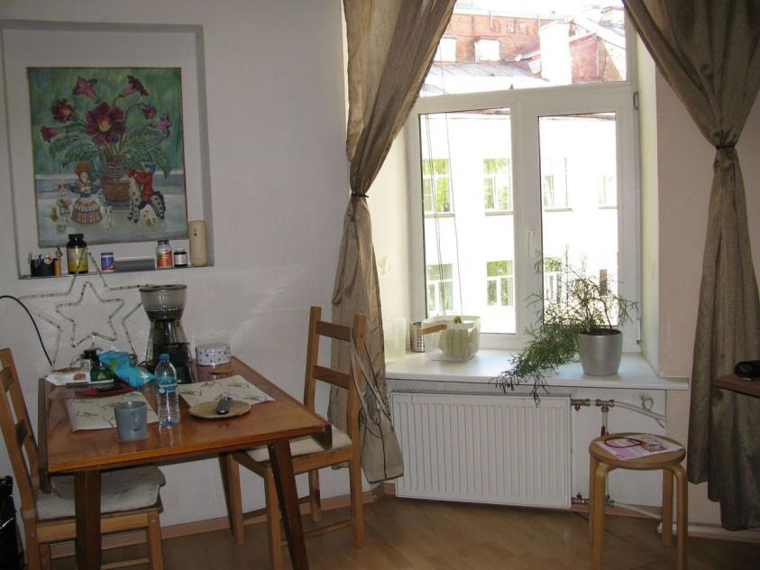 Общая площадь квартиры составляет 60 квадратных метров, из которых 22 кв.м занимает жилая комната, а кухня площадью 28 кв.м совмещена с зоной гостиной, что создает удобное разделение жилого пространства. Высота потолков — 2,81 метра. Квартира расположена на 4 этаже пятиэтажного кирпичного дома. Санузел совмещенный, его площадь составляет 8 кв.м. Окна выходят во двор, что обеспечивает светлый и тихий интерьер с видом на закрытую территорию и фрагмент купола Исаакиевского собора..