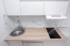 Кухонная зона с кухонным гарнитуром, с бытовой техникой, в том числе варочной поверхностью на 2 конфорки, вытяжкой, холодильником.