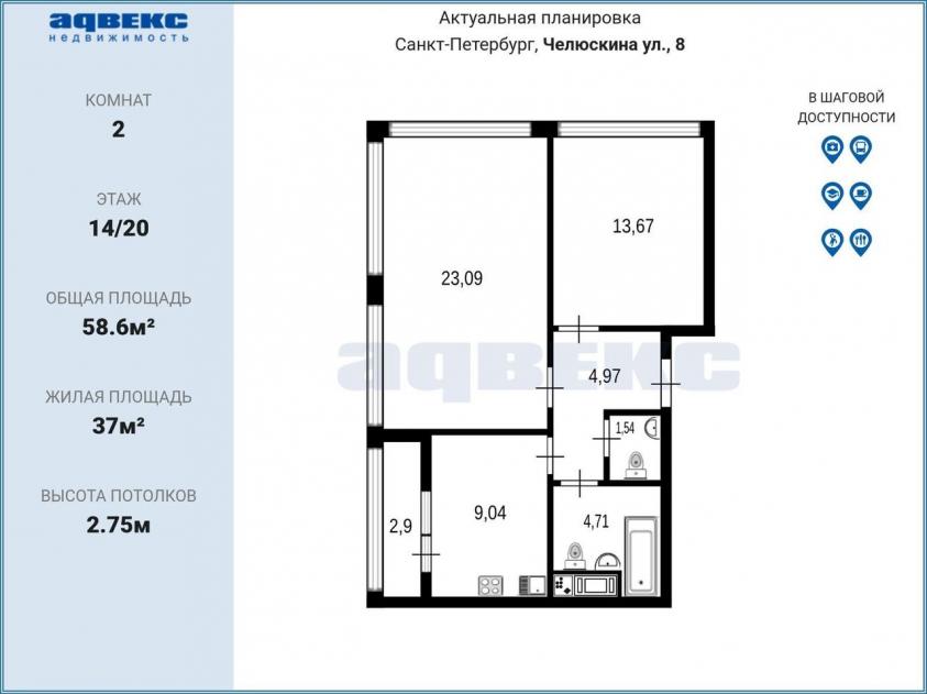 Общая площадь квартиры составляет 58,6 квадратных метров. Жилая площадь распределена между двумя комнатами — 14 и 23 квадратных метра, кухня занимает 9 квадратных метров. Квартира двусторонняя, имеет свободное планировочное решение .Высота потолков в квартире — 2,75 метра. Объект находится на 14 этаже 20-этажного дома. Планировка предусматривает раздельный санузел, кроме того, в квартире имеется лоджия. Жилое помещение предлагается без ремонта, что позволит будущему владельцу сделать отделку по своему вкусу.