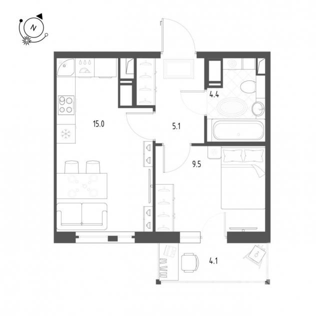№344414 Продается уютная квартира ( 2Е) , где 1 комната + кухня-гостинная, в современном жилом комплексе ЖК Монография . 35,1м2