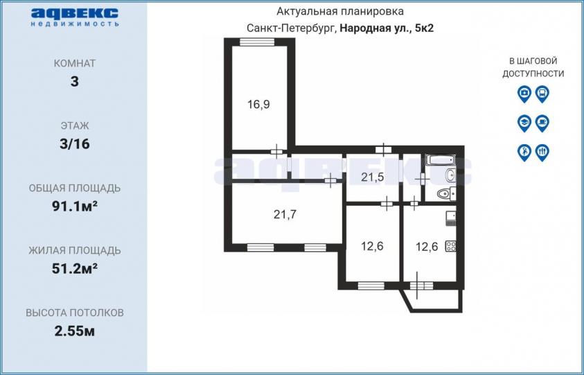 Продуманная планировка с гардеробной и большими правильной формы комнатами. Высота потолков — 2,55 м.