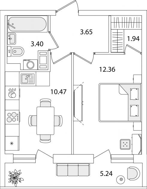 1-комнатная квартира34.4 кв.м.
