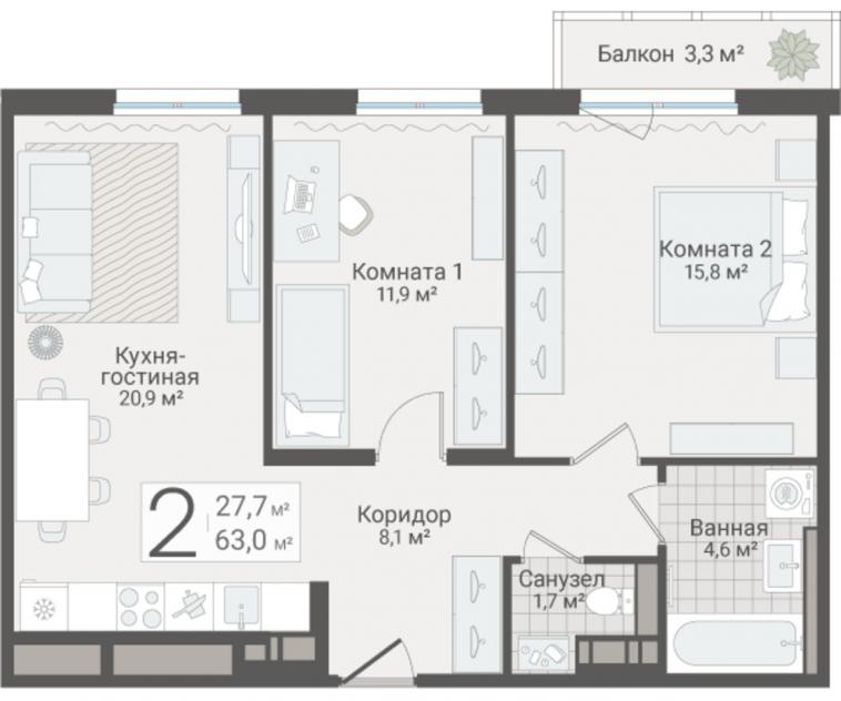 2-комнатная квартира63 кв.м.