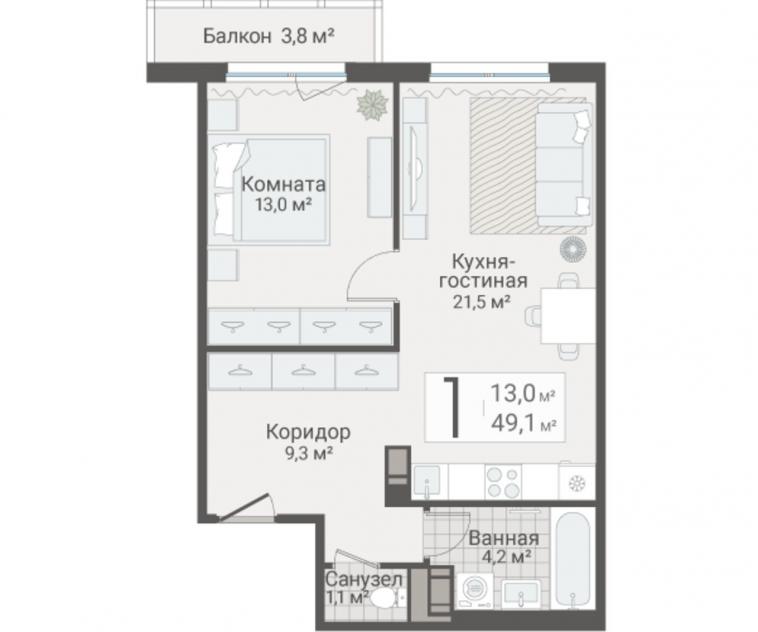 1-комнатная квартира49.1 кв.м.