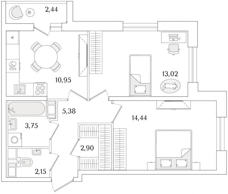 2-комнатная квартира53.8 кв.м.