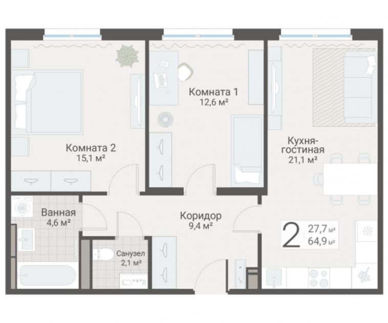 2-комнатная квартира64.9 кв.м.