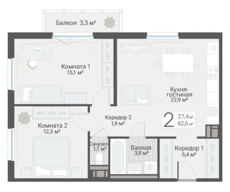 2-комнатная квартира62.6 кв.м.