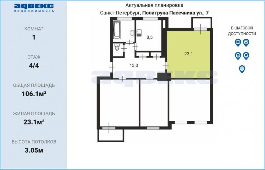 Предлагается к продаже комната площадью 23,1 м2 в просторной 4-комнатной квартире. В комната сделан косметический ремонт. Наличие балкона – это дополнительное преимущество, которое можно использовать для организации зоны отдыха или хранения.
