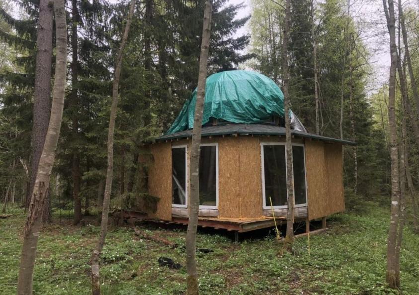 Почти достроенная баня , необычной формы в виде купола, двухуровневая с панорамными окнами, фундамент на сваях, полы ,стены и крыша- утепленные.