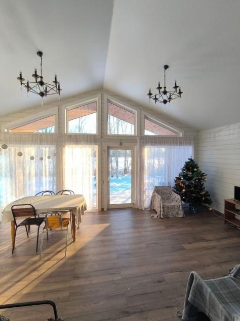 О ДОМЕ: Светлый новый дом со свежим ремонтом. Высота потолка от 2.7м. до 4.7м. в коньке. Стены- крашенная имитация бруса, потолки- натяжные по скатам кровли, уложен ламинат и плитка, тёплые водяные полы. В доме 2 спальни, кухня гостиная с окнами в пол, терраса 14 м. и совмещенный санузел. До продается укомплектованным: кухня с мойкой, варочная панель, холодильник, стиральная машина, душевая кабина, унитаз, раковина в с/у, бойлер, люстры и светильники.