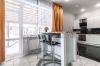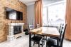Просторная кухня-гостиная 45 кв.м — идеальное место для семейных вечеров и приёма гостей с красивым электрическим камином.