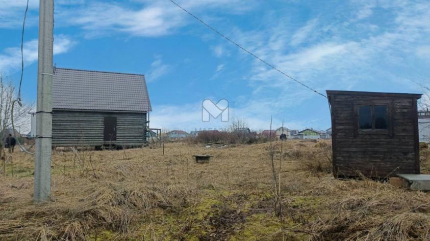 На участке заведен под крышу сруб из бревна 8 х 8, дом уже отстоялся, внутри сухо, так как окна не прорубали. Также есть жилая бытовка с печкой. Электричество и вода на участке.