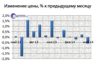 В предложении с разбивкой по типу дома в мае 2014 года, как и в апреле 2014-го, преобладают панельные дома старой постройки, их доля на конец мая составляет 49,2%. Также наибольший объем в структуре предложения занимают кирпичные дома – 37,7% от всего рынка. Меньший процент приходится на квартиры в сталинских домах и домах старого фонда.