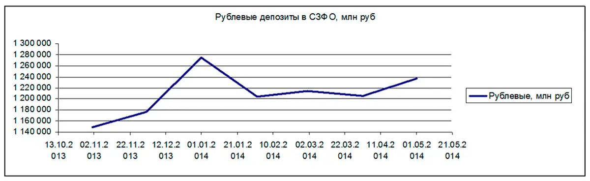 К 1 мая 2014 года разница в общей сумме рублевых и валютных депозитов по сравнению с началом февраля была порядка 10 млрд руб. Разумеется, статистика ЦБ не дает нам возможности утверждать, что именно 10 млрд руб. перешли с депозитов на рынок недвижимости Северо-Запада за время весеннего ажиотажа, так как недвижимость люди приобретали и на те средства, что хранили в наличных у себя дома или в банковских ячейках. То есть в реальности общий объем сделок был, скорее всего, выше, но благодаря статистике ЦБ мы хотя бы знаем порядок цифр. Последующее возобновление роста рублевых депозитов к маю можно объяснить стабилизацией курса рубля и возвращением в банки тех людей, кто не смог по каким-либо причинам подобрать себе подходящую недвижимость.