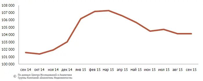 С началом лета, после передышки, российский рубль вновь пошел ко дну – сначала нехотя, но с августа – все более уверенно. Примечательно, что на сей раз, в отличие от зимней ситуации, оживления на рынке жилья не случилось, корректировки цен тоже. Так если в январе, по сравнению с декабрем, средние цены предложения выросли на 3%, то в период с апреля по август они плавно снизились на те же 3% (по данным Центра исследований и аналитики ГК «БН» в первой половине сентября тенденция к снижению сохранилась – см. график 1).