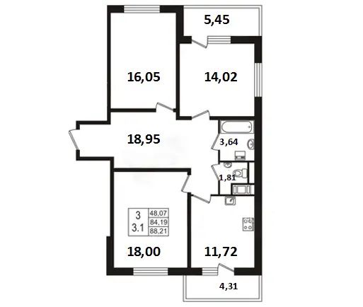 Наш герой после недолгих поисков обращается в компанию Setl Group. Здесь ему предлагают трехкомнатную квартиру в ЖК «GreenЛандия» у станции метро «Девяткино». Площадь квартиры – 84,2 кв. м, стоимость 5,5 млн руб., планировка – на рис. 1.