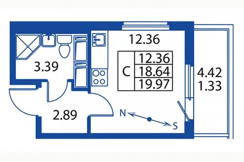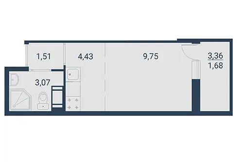 Выбор студий, действительно, широк, вплоть до вариантов площадью 29 кв. м. А самые маленькие имеют площадь 18 квадратов – абсолютный рекорд нашего списка. Планировка, меж тем, вполне продуманная: небольшая, но удобная прихожая квадратной формы (2,8 кв. м.), совмещенный санузел, в который поместится душевая кабина, но никак не ванна. И, опять же, почти квадратная гостиная (12,3 кв. м), совмещенная с кухонным пространством.