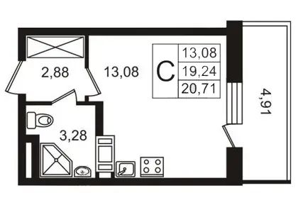 В этом жилом комплексе покупатели могут приобрести студии площадью от 19,1 кв. м. В квартире среднего размера – по меркам студий – прихожая (2,9 кв. м), ванная (3,2 кв. м.) и комната 13 «квадратов». Большим плюсом является просторная лоджия – почти 5 «квадратов»!