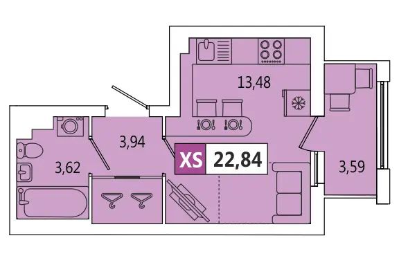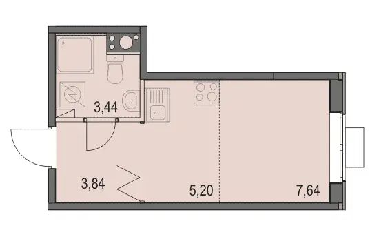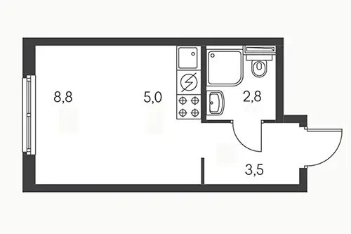 Здесь осталось немного студий, но все же они есть, причем небольшие, от 22,1 кв. м. Насколько рациональна планировка, судите сами: площадь жилой зоны всего 14,2 кв. м, зато на прихожую и ванную комнату выделено почти по 4 «квадрата». В квартире нет балкона и это, безусловно, минус.