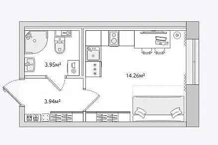 Планировка продумана. Входя в квартиру, человек попадает в просторную прихожую (3,9 кв. м), из которой есть два прохода – в ванную (3,6 кв. м) и жилую/кухонную зону (13,5 кв. м). Плюс планировка включает лоджию площадью 3,59 кв. м.