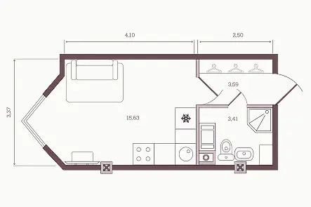 Планировка, можно сказать, очень сбалансированная. На прихожую архитекторы отвели почти 3,6 кв. м. На ванную комнату – 3,4 кв. м. Жилая комната имеет площадь 15,6 кв. м, причем она имеет эркер – треугольную часть, выступающую за плоскость фасада. Это улучшает освещенность и позволяет реализовать более интересный дизайн проект.