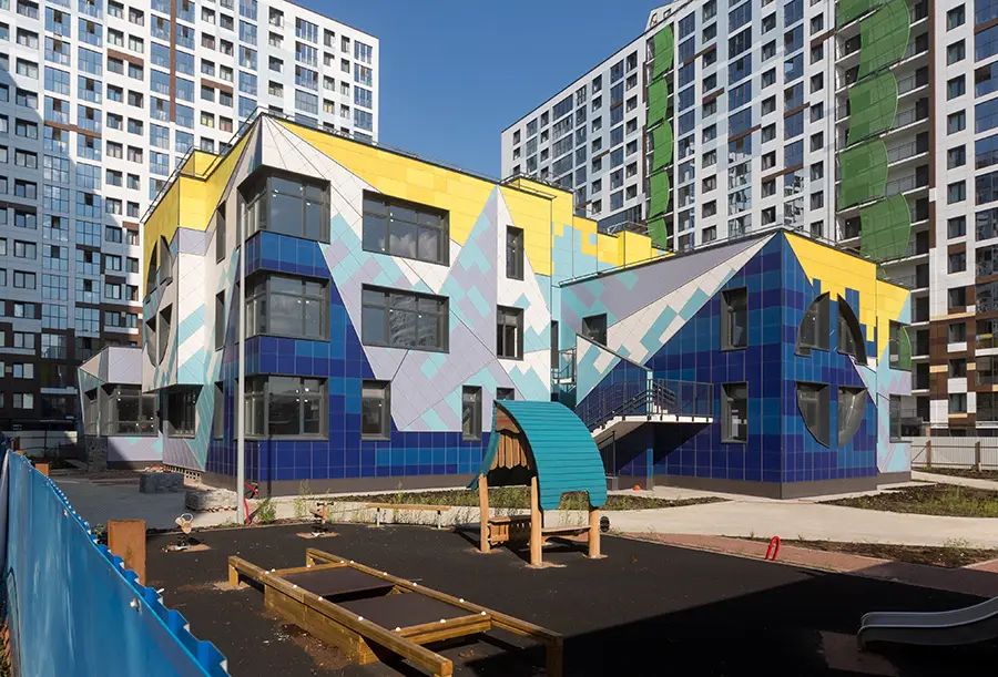 Ничего из заявленного застройщиком в рамках проекта (торговый центр, спа, культурные пространства, обсерватория и многое другое) пока нет в помине. Оценить можно только благоустройство дворовых территорий, которое отличается продуманным дизайном: детские и спортивные площадки с каучуковым покрытием, зоны отдыха с гамаками, много стильных деревянных скамеек, декоративные бассейны с подсветкой, уже проведено озеленение.