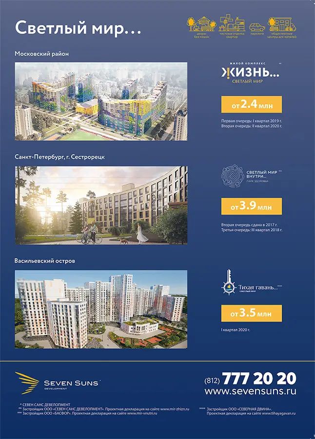 В-третьих, бонусом могут идти прекрасные виды из окон, причем не только в премиальных домах, как на Петровском острове, но и в обычном комфорт-классе, как на Октябрьской набережной. В качестве эталона назовем уже построенный жилой комплекс «Светлый мир “О’Юность…”» (Seven Suns Development), в котором отличными видовыми характеристиками обладает более половины квартир.
