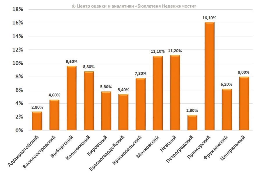 Аналитики BN.ru проанализировали структуру предложения и по районам. Лидером стал Приморский, где сосредоточено 16,1% от всего объема предложения по аренде. За ним следуют Невский, Московский, Выборгский и Калининский районы, их доля в предложении – 11,2%, 11,1%, 9,6% и 8,8%. Минимум объектов, предлагаемых в аренду, зафиксирован в Адмиралтейском и Петроградском районах: 2,8% и 2,3% соответственно. Чем больше доля предложения, тем, соответственно, больше конкурентов у арендодателей. Этот фактор нужно тоже учитывать.