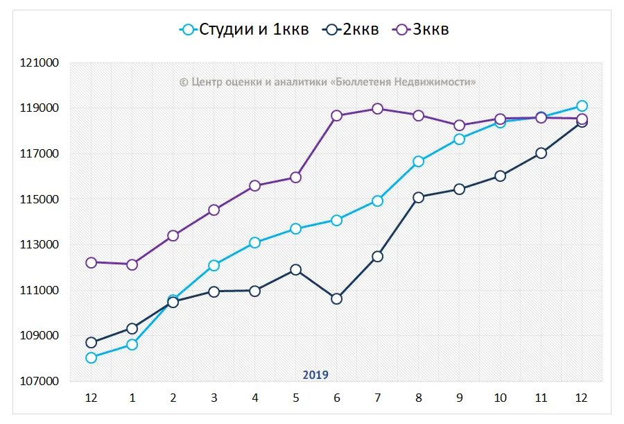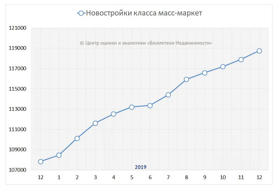 По данным Центра оценки и аналитики BN.ru, за 2019 год средняя цена предложения на рынке петербургских новостроек класса масс-маркет (эконом + комфорт) выросла на 10,1%, или 10,9 тыс. руб. за кв. м, и к началу января составила 118,8 тыс. руб. за кв. м.