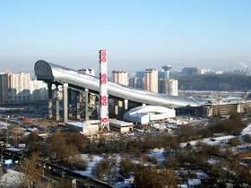 Для того, чтобы сам комплекс выглядел изящно, была использована мостовая конструкция: спуск как бы парит в воздухе. Основа горы – металлические конструкции. При строительстве использовалась высокопрочные низколегированные стали толщиной 40 мм. Это стали 345 и 390 класса нагрузки. Сталь такого класса практически не подвергается коррозии под воздействием окружающей среды. На вертикальные опоры крепились фермы пола. Их собирали на земле, скрепляя болтами. Каждый болт способен выдержать нагрузку в 27 тонн! Тонкость строительства – всю ферму необходимо собирать, выдерживая температурный режим – иначе все болты придется перетягивать. Самая легкая ферма весит 156 т, самая тяжелая 292 т, ее пришлось поднимать на высоту 60 метров!