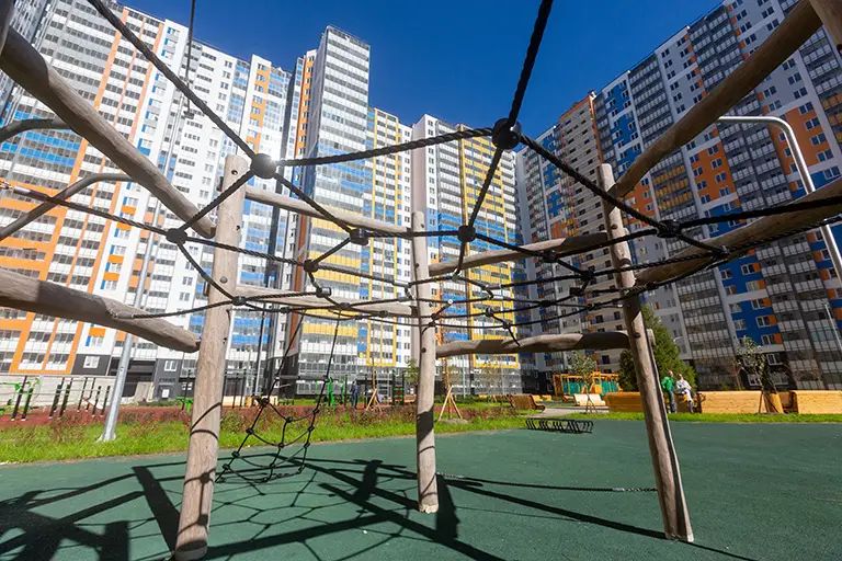 Во дворе нас встречает детская площадка с безопасным веревочным парком. По дизайну она выгодно отличается от разноцветных типовых детских городков. Есть также спортивная зона с тренажерами.