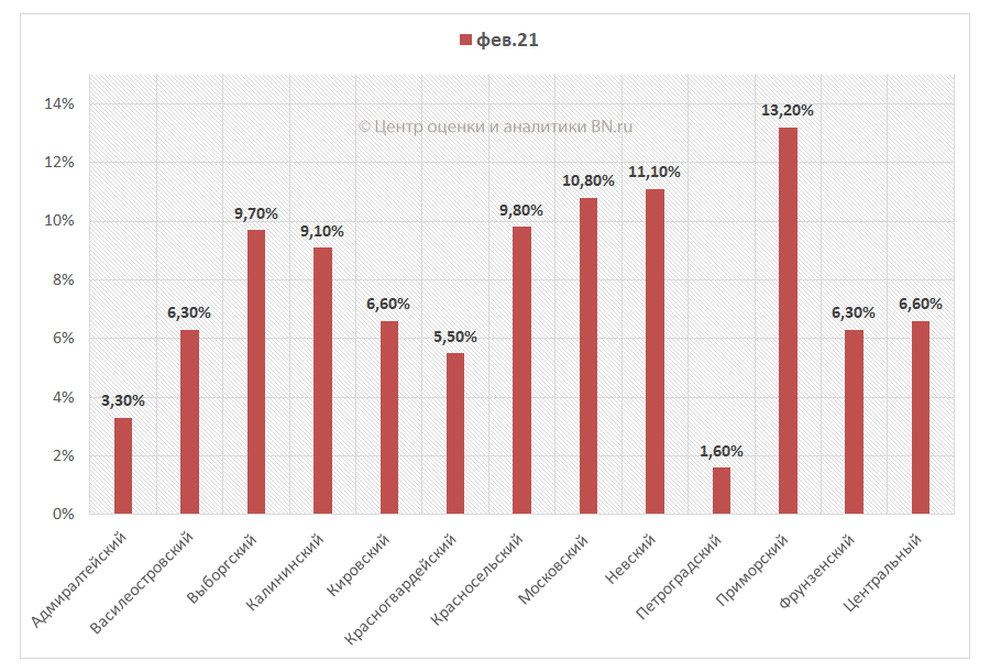В структуре предложения по районам лидирующие позиции занимает Приморский район Петербурга, в котором сосредоточено 13,2% от всего объема предложения на рынке аренды жилья. Минимальное количество объектов, предлагаемых в аренду, – в Петроградском районе. Его доля составила всего 1,6%.