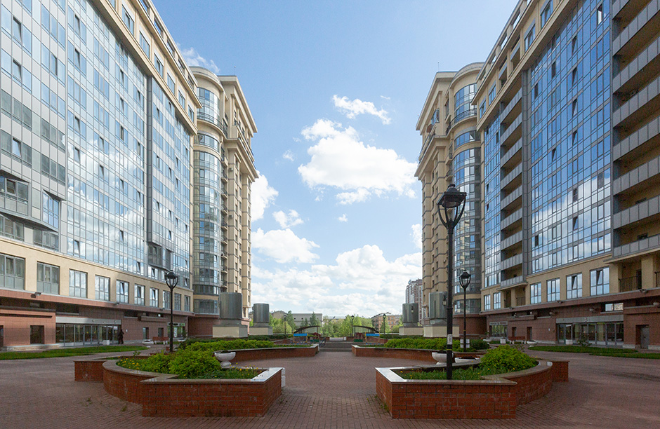 Этот проект не просто органично влился в окружающую архитектуру, но и стал ее украшением. Облик ЖК одновременно величественен и строг, светлые разноэтажные здания объединены в общий архитектурный ансамбль (что характерно и для екатерининской классики, и для сталинского ампира).