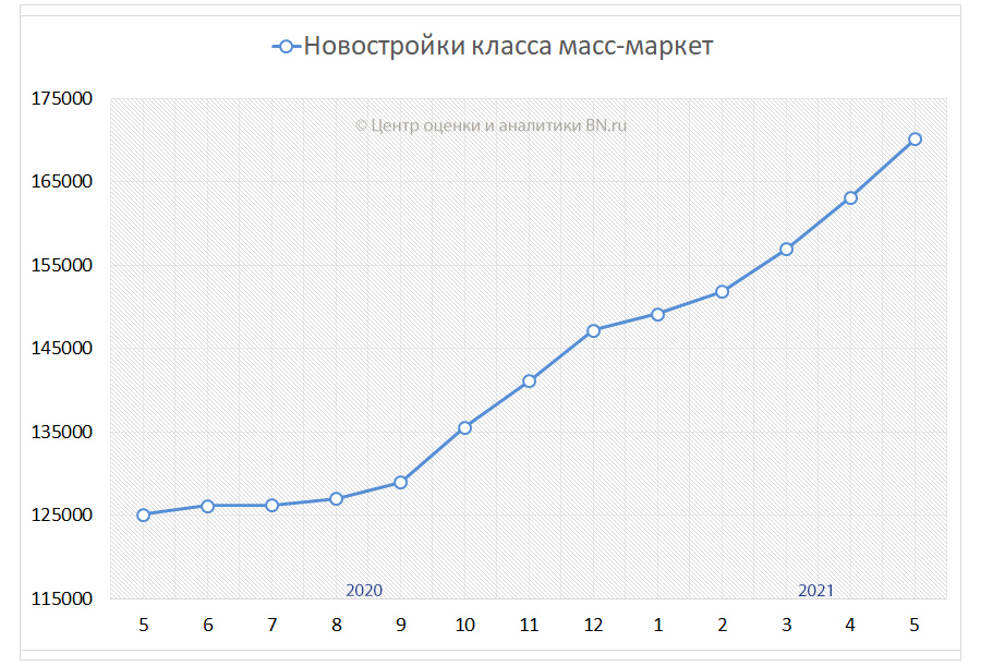 – По данным Центра оценки и аналитики BN.ru, за май 2021 года средняя цена предложения петербургских новостроек (без учета элит-класса) выросла на 4,26%, или 6995 руб. за кв. м. И к началу июня составила 170,1 тыс. руб. за кв. м.
