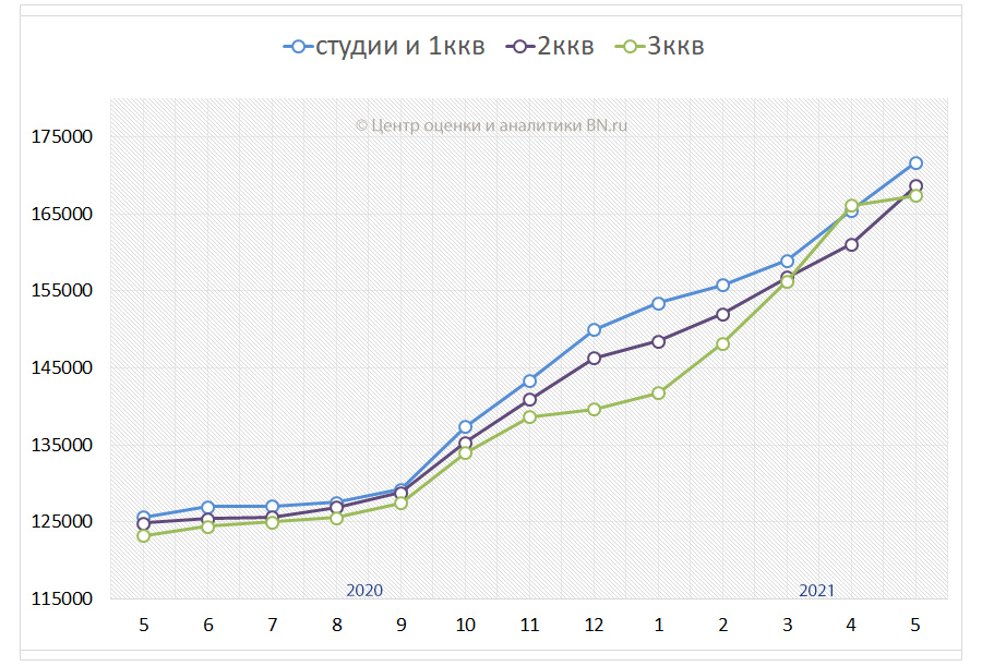 По данным Центра оценки и аналитики BN.ru, за май 2021 года средняя цена предложения вторичного рынка квартир Санкт-Петербурга увеличилась на 4,08%, или на 6900 руб. с кв. м. И к концу месяца составила 175,8 тыс. руб. за кв. м.