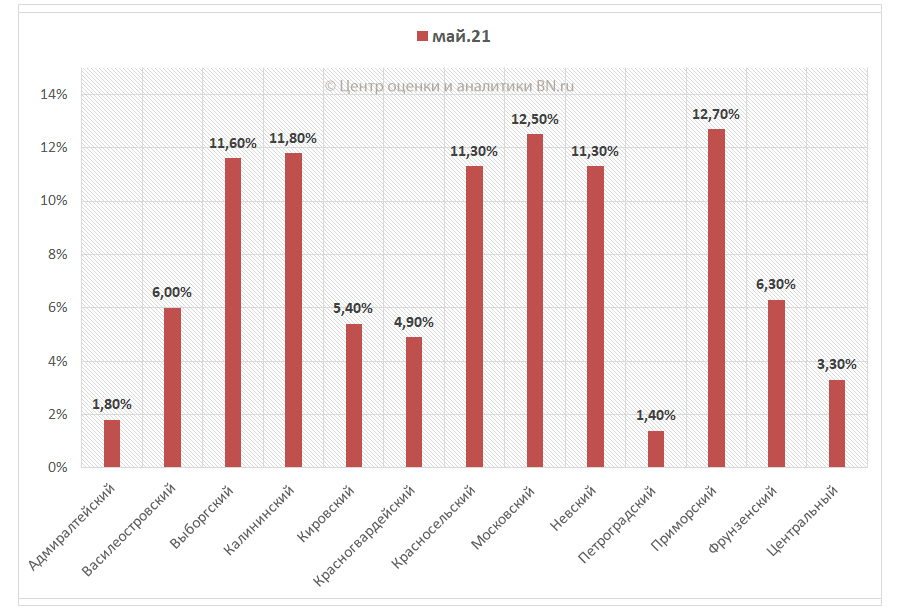 В структуре предложения по районам лидирующие позиции занимает Приморский район Петербурга, в котором сосредоточено 12,7% от всего объема предложения на рынке аренды жилья. Минимальное количество объектов, предлагаемых в аренду, – в Петроградском районе. Его доля составила всего 1,4%.