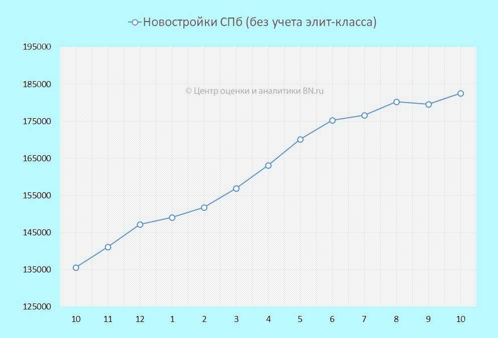 – За десять месяцев 2021 года квадрат в новостройках класса масс-маркет в Петербурге подорожал на 25,5% (рост по итогам 12 месяцев 2020 года составил 26,4%), до 181,7 тыс. руб. Таким образом, показатель роста цены по итогам текущего года, скорее всего, повторит значения предыдущего, 2020-го.