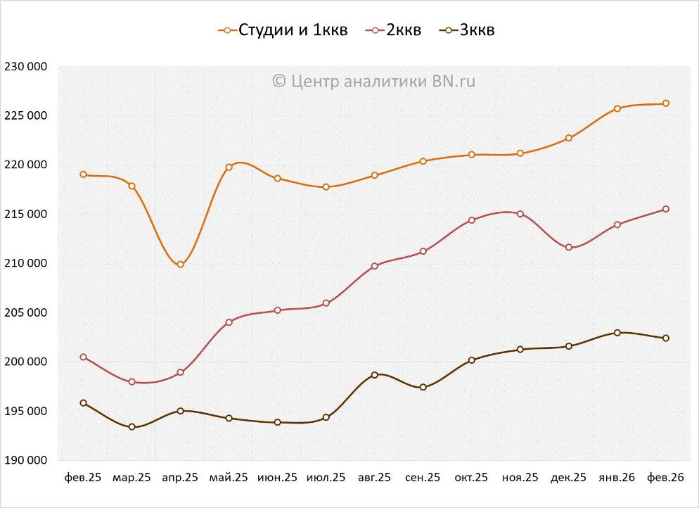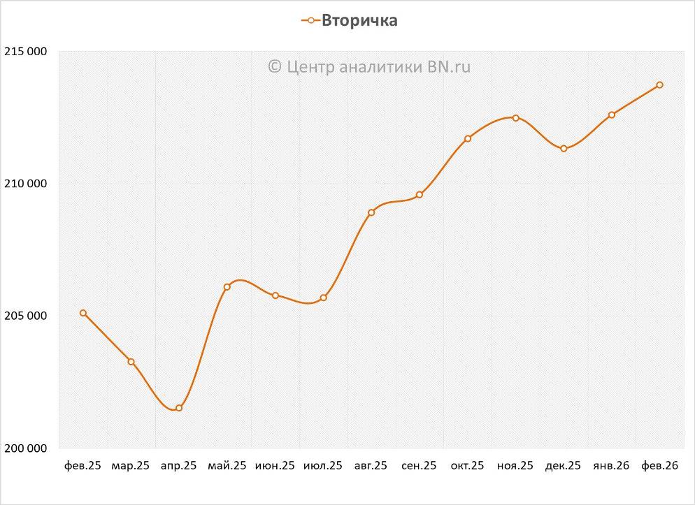 Средняя цена предложения на регулярном рынке жилья сегмента масс-маркет, по подсчетам Центра аналитики BN.ru, по сравнению с прошлым месяцем выросла на 0,53%, что в рублевом эквиваленте составило 1 132 руб. с кв. м. Показатель средней цены предложения на конец февраля 2026 года – 213,7 тыс. руб. за кв. м.