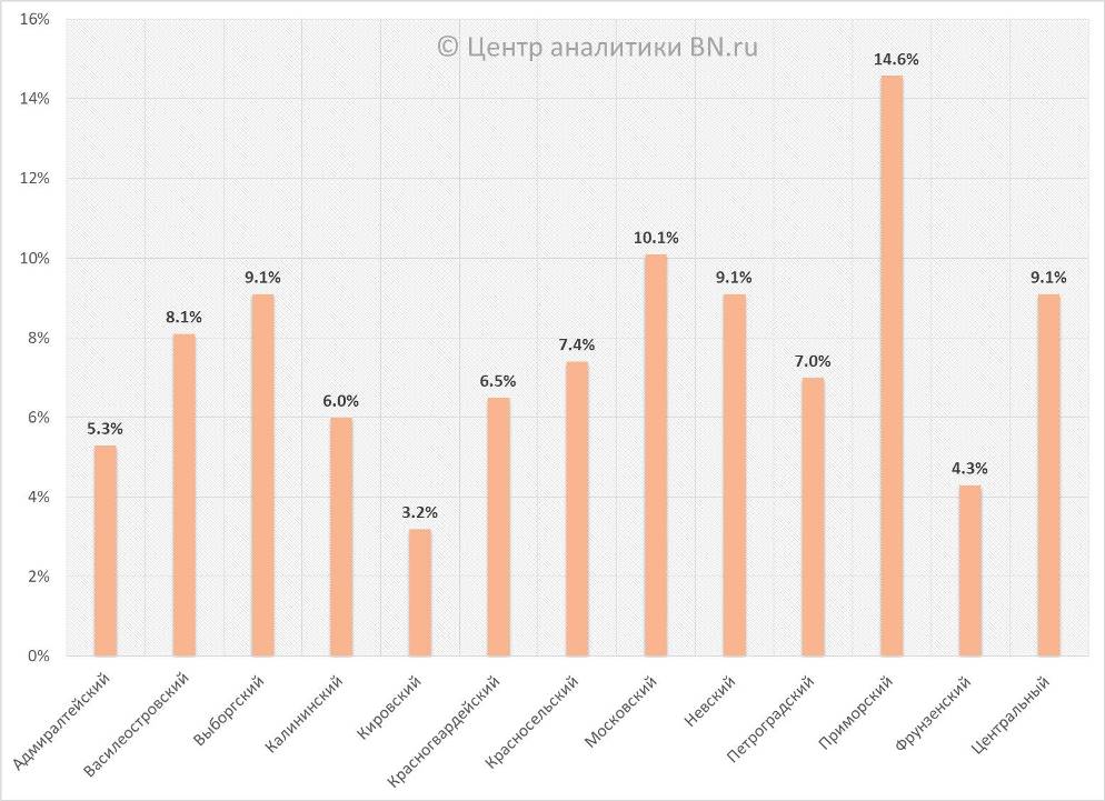 Структура предложения по районам Петербурга, % от общего объема