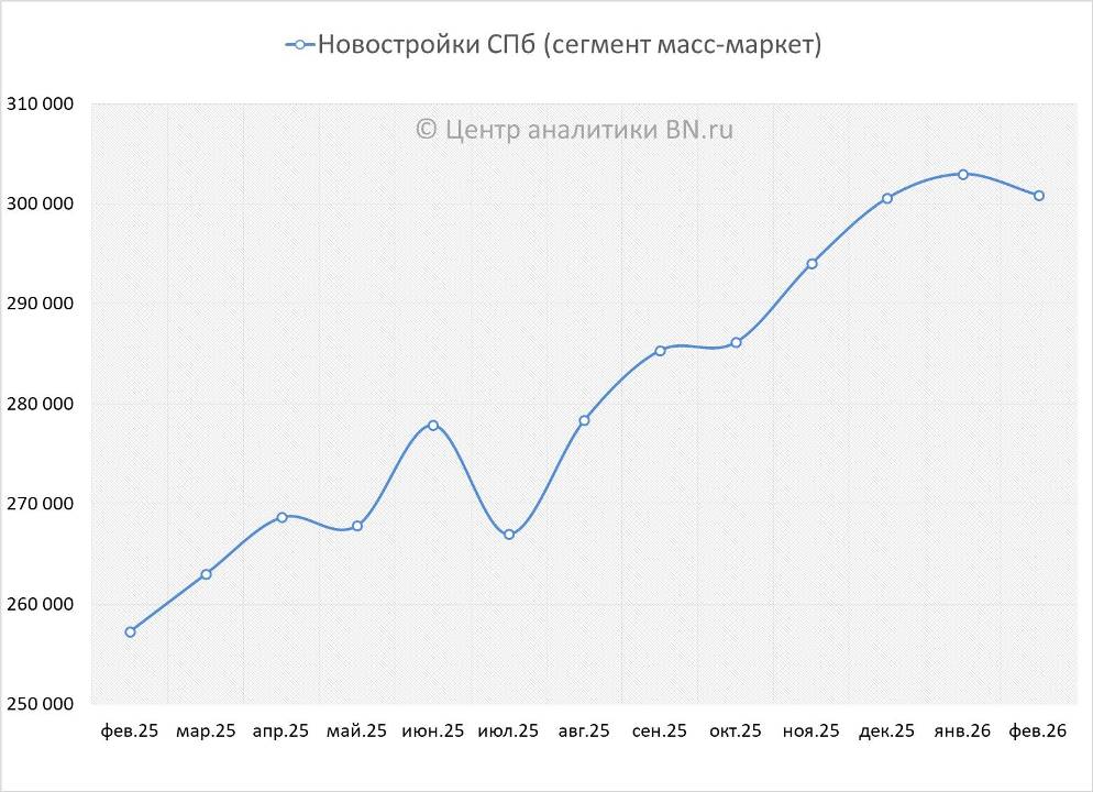 По данным Центра аналитики BN.ru на рынке новостроек массового сегмента Санкт-Петербурга средняя цена предложения в феврале снизилась на 0,7% (это 2 124 руб. с кв. м) и к началу весны составила 300,9 тыс. руб. за кв. м. Как обычно, в расчет принималось только строящееся жилье классов комфорт и стандарт.