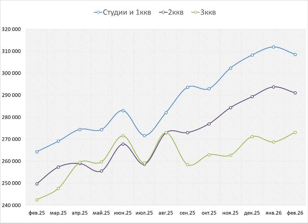 | Тип квартиры | Цена | Январь 2026 | Февраль 2026 | Изменение за месяц |