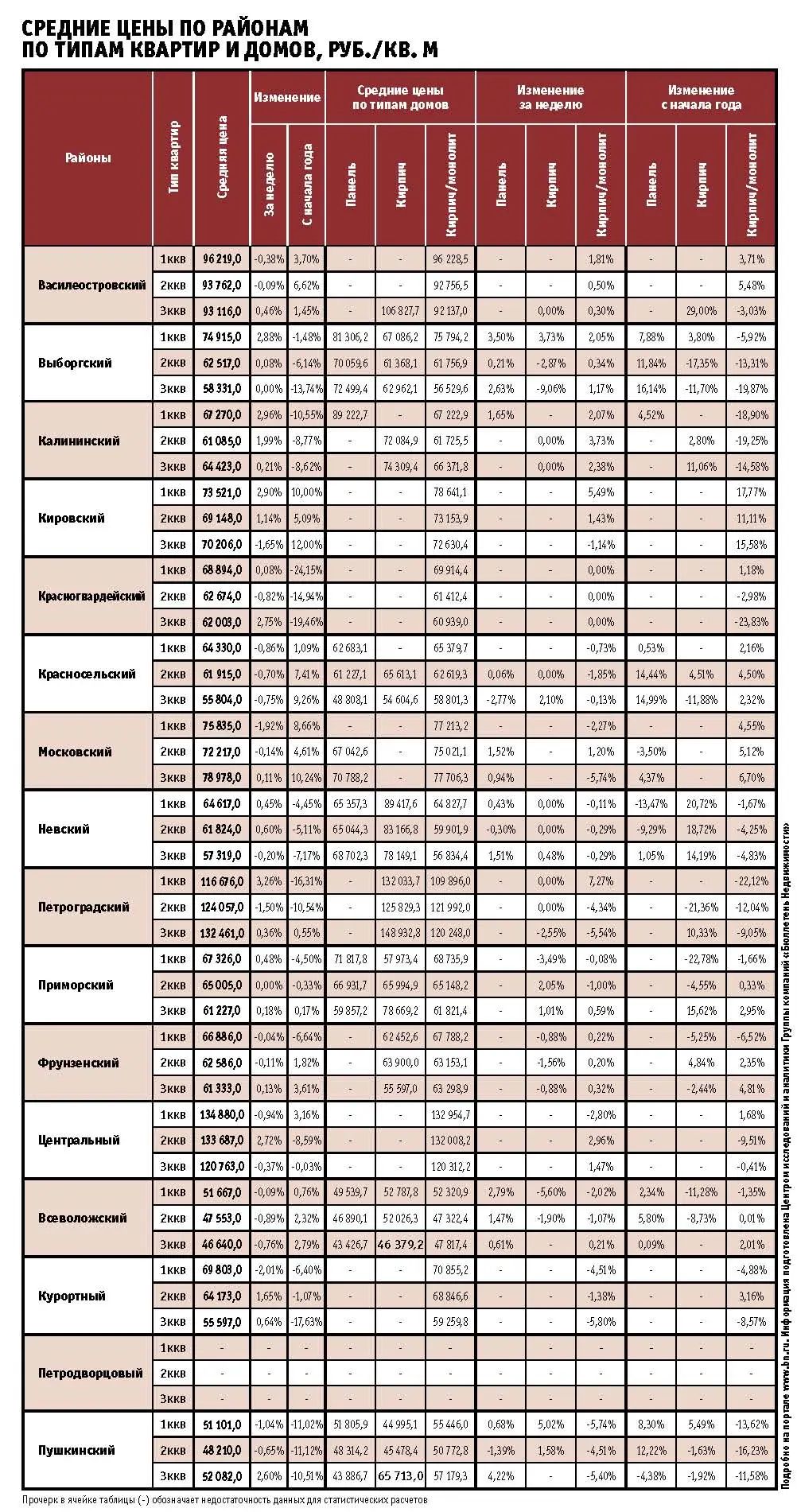 Несмотря на общую, казалось бы, отрицательную динамику, показатели по районам довольно оптимистичные. «Минусовыми» стали только два района: в Московском средняя цена жилья в новостройках снизилась на 0,98% (до 75,7 тыс. руб. за кв. м), а в Красносельском – на 0,71% (до 61,5 тыс. руб. за кв. м). Остальные районы города вышли в «плюс». Наибольшие показатели у Петроградского района (1,35%, или 126,6 тыс. руб. за кв. м), Кировского (1,29%, средняя цена – 70,7 тыс. руб. за кв. м) и Центрального (1,02%, стоимость квадратного метра 127,95 тыс. руб.).