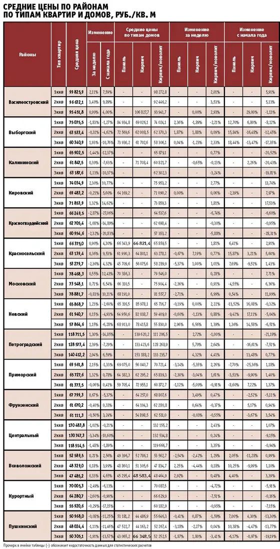 Наибольшая положительная динамика наблюдалась в двух районах: в Василеостровском жилье подорожало на 1,98%, до 97,5 тыс. руб., в Петроградском – на 2,05%, до 132,9 тыс. руб. за кв. м. В Красногвардейском и Центральном районах квартиры в новостройках подешевели. В первом – на 2,47%, средняя цена квадратного метра составила 62,7 тыс. руб. В Центральном падение чуть меньше – 2,4%, квартиры предлагают из расчета 124,7 тыс. руб. за кв. м.