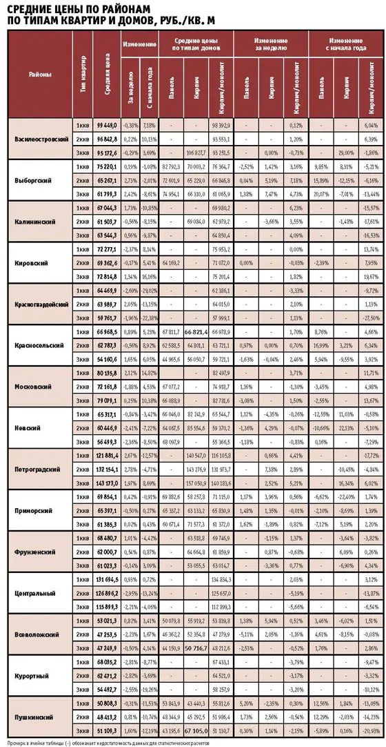 Наиболее ощутимые колебания произошли в районах центра. Так, в Петроградском отмечен наибольший рост – 2,52% (средняя цена – 136,2 тыс. руб. за кв. м), а в Центральном, напротив, падение – 2,01% (сейчас квадратный метр здесь можно купить за 122,2 тыс. руб.).