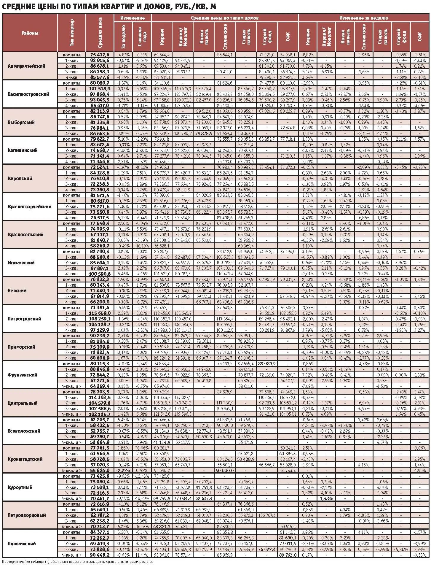 Лидерами роста на прошедшей неделе стали Центральный район, где стоимость квадратного метра выросла на 1,61% (средняя цена 103,1 тыс. руб. за кв. м), и Московский – с ростом на 1,19% (стоимость метра 88,1 тыс. руб.). А самые недорогие районы – Красносельский и Невский – подешевели. Жилье в Красносельском потеряло 0,19% цены (метр здесь оценивают в 67,7 тыс. руб.), в Невском – 0,42%, сейчас квартиры здесь предлагают из расчета 72,7 тыс. руб. за «квадрат». В других районах колебания незначительны, причем преимущественно – в сторону увеличения стоимости.