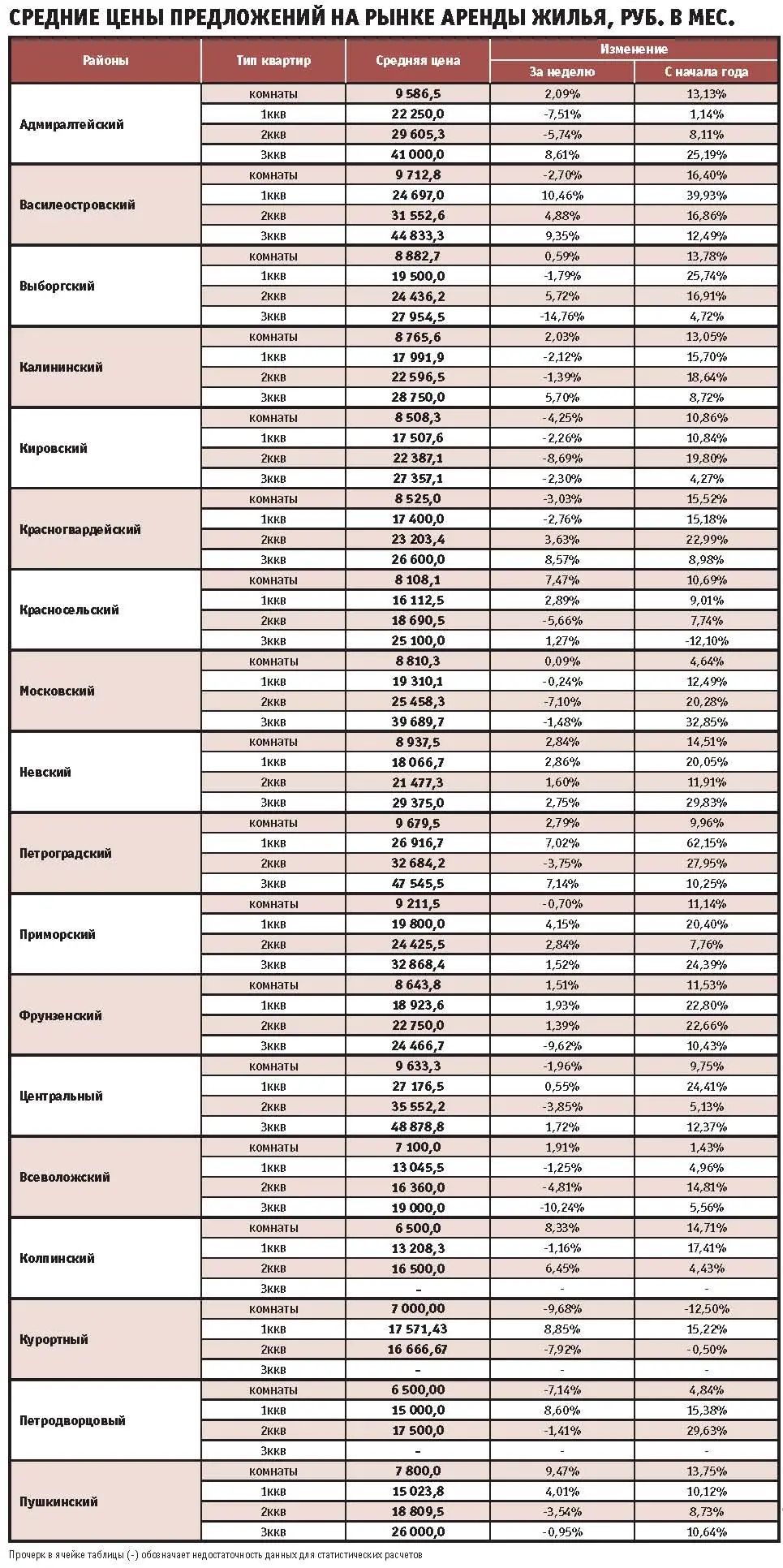 Растущим на минувшей неделе был Василеостровский район, где значительно увеличились сразу два сегмента: однокомнатные квартиры подорожали на 10,46% (средняя арендная ставка – 24,7 тыс. руб. в месяц), трехкомнатные – на 9,35% (цена составила 44,8 тыс. руб.). В Красногвардейском районе увеличилась стоимость трехкомнатных квартир на 8,57%, до 26,6 тыс. руб. в месяц. Самое значительное падение наблюдалось в Выборгском районе, где месячная ставка на трехкомнатные квартиры уменьшилась на 14,76%, до 27,95 тыс. руб. Во Фрунзенском районе в цене потерял также сегмент больших квартир – цена трехкомнатных снизилась на 9,62% и составила 24,5 тыс. руб.