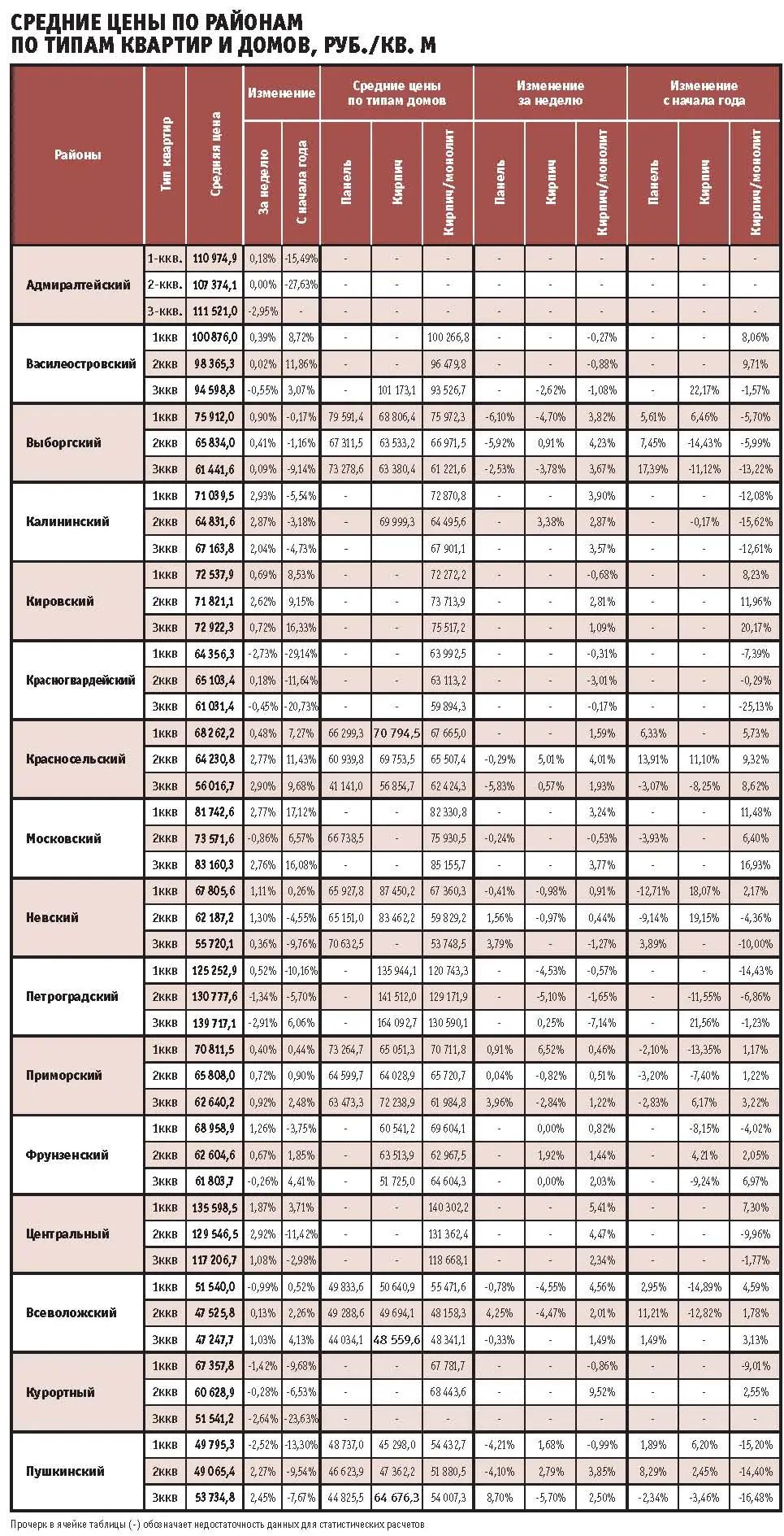 Больше всего за прошедшую неделю цены на первичное жилье снизились в Петроградском районе – на 2,28%. Несмотря на это, средняя цена в данном районе считается самой высокой в Петербурге – 134 тыс. руб. за кв. м. Лидерами роста остаются Калининский (2,84%) и Красногвардейский (2,37%) районы. Средние цены на квартиры в здешних новостройках составили 67,9 тыс. руб. и 64,6 тыс. руб. за кв. м соответственно.
