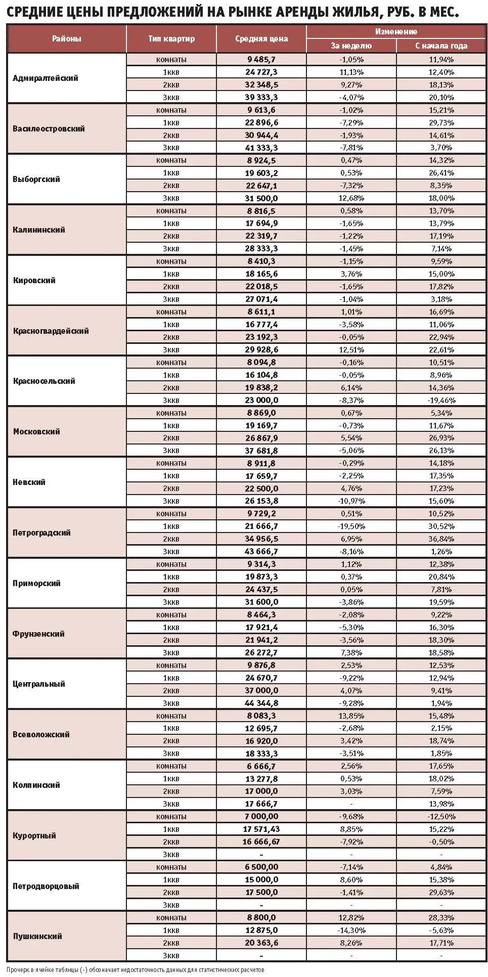 днокомнатные в Центральном стали стоить меньше на 5,49% ( 25,8 тыс. руб.), а трехкомнатные – на 5,83% (44,6 тыс. руб.). Лидер роста – Петроградский район, где выросли все сегменты, от 1,7% на однокомнатные до 6,51% на трехкомнатные (средняя цена – 43,3 тыс. руб. в месяц). Двухкомнатные увеличились на 9,42% (арендная ставка – 36,9 тыс. руб. в месяц). Во Фрунзенском районе ощутимо выросли двухкомнатные квартиры – на 7,21%, до 23,5 тыс. руб. в месяц.