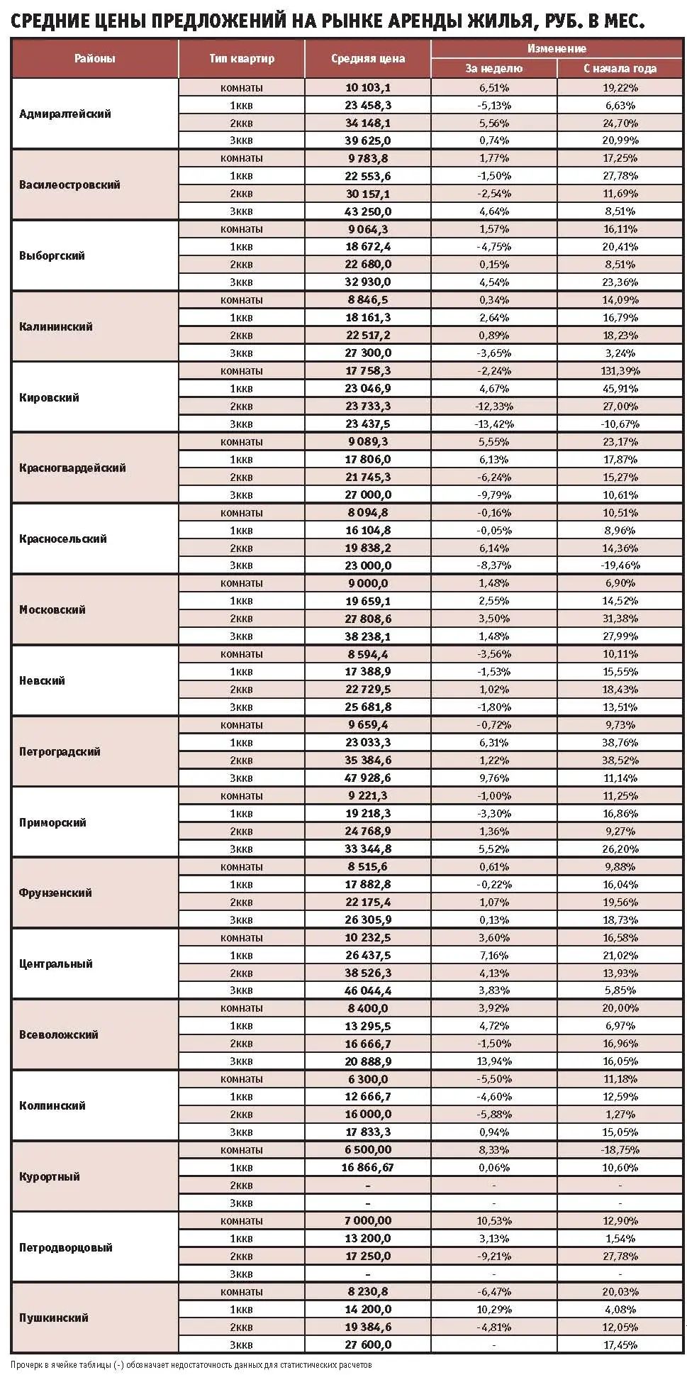 Самое значительное увеличение арендных ставок на прошедшей неделе – в районах центра города. На 9,76% подорожали трехкомнатные квартиры в Петроградском районе (средняя цена – 47,9 тыс. руб. в месяц). В Центральном – на 7,16%, до 26,4 тыс. руб. в месяц, увеличились ставки на однокомнатные квартиры. В Адмиралтейском районе комнаты стали стоить на 6,51% дороже, средняя цена таких вариантов поднялась до 10,1 тыс. руб. в месяц.